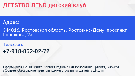 ДЕТSТВО ЛЕND, детский клуб по адресу 344016, Ростовская область, Ростов-на-Дону, проспект Горшкова, 2а в дальнейшем Организация, размещена в следующих категориях: