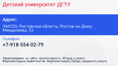 Детский университет ДГТУ по адресу 346723, Ростовская область, Ростов-на-Дону, Менделеева, 53 в дальнейшем Организация, размещена в следующих категориях: