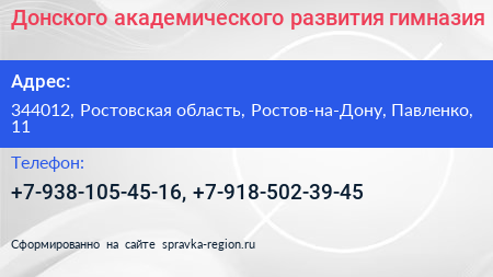 Донского академического развития, гимназия по адресу 344012, Ростовская область, Ростов-на-Дону, Павленко, 11 в дальнейшем Организация, размещена в следующих категориях: