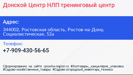 Донской Центр НЛП, тренинговый центр по адресу 344002, Ростовская область, Ростов-на-Дону, Социалистическая, 52а в дальнейшем Организация, размещена в следующих категориях: