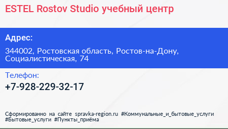 ESTEL Rostov Studio, учебный центр по адресу 344002, Ростовская область, Ростов-на-Дону, Социалистическая, 74 в дальнейшем Организация, размещена в следующих категориях: