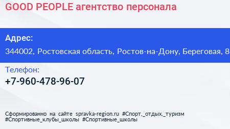 GOOD PEOPLE, агентство персонала по адресу 344002, Ростовская область, Ростов-на-Дону, Береговая, 8 в дальнейшем Организация, размещена в следующих категориях: