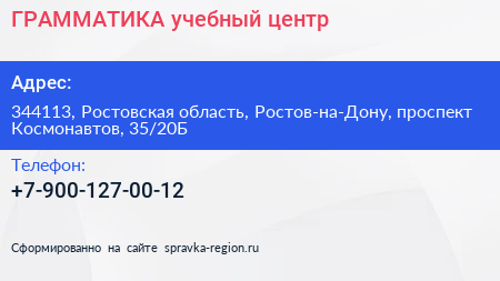 ГРАММАТИКА, учебный центр по адресу 344113, Ростовская область, Ростов-на-Дону, проспект Космонавтов, 35/20Б в дальнейшем Организация, размещена в следующих категориях:
