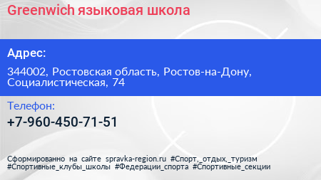 Greenwich, языковая школа по адресу 344002, Ростовская область, Ростов-на-Дону, Социалистическая, 74 в дальнейшем Организация, размещена в следующих категориях: