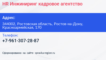 HR Инжиниринг, кадровое агентство по адресу 344002, Ростовская область, Ростов-на-Дону, Красноармейская, 170 в дальнейшем Организация, размещена в следующих категориях: