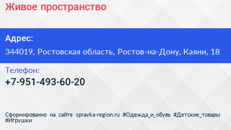 Живое пространство по адресу 344019, Ростовская область, Ростов-на-Дону, Каяни, 18 в дальнейшем Организация, размещена в следующих категориях: