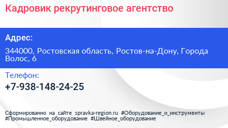 Кадровик, рекрутинговое агентство по адресу 344000, Ростовская область, Ростов-на-Дону, Города Волос, 6 в дальнейшем Организация, размещена в следующих категориях: