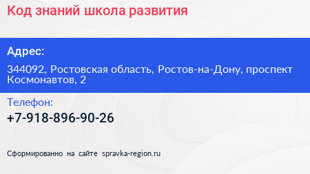 Код знаний, школа развития по адресу 344092, Ростовская область, Ростов-на-Дону, проспект Космонавтов, 2 в дальнейшем Организация, размещена в следующих категориях: