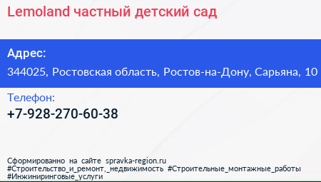 Lemoland, частный детский сад по адресу 344025, Ростовская область, Ростов-на-Дону, Сарьяна, 10 в дальнейшем Организация, размещена в следующих категориях: