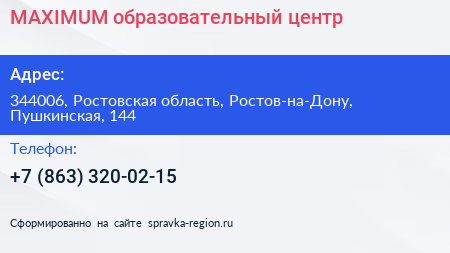 MAXIMUM, образовательный центр по адресу 344006, Ростовская область, Ростов-на-Дону, Пушкинская, 144 в дальнейшем Организация, размещена в следующих категориях: