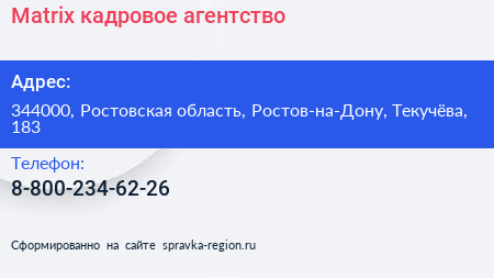 Matrix, кадровое агентство по адресу 344000, Ростовская область, Ростов-на-Дону, Текучёва, 183 в дальнейшем Организация, размещена в следующих категориях: