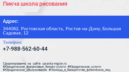 Пикча, школа рисования по адресу 344082, Ростовская область, Ростов-на-Дону, Большая Садовая, 12 в дальнейшем Организация, размещена в следующих категориях:
