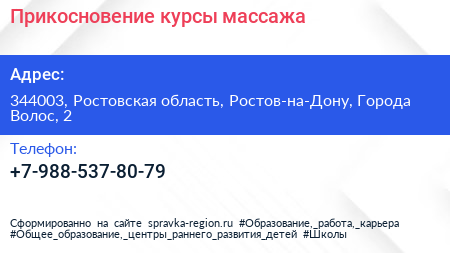 Прикосновение, курсы массажа по адресу 344003, Ростовская область, Ростов-на-Дону, Города Волос, 2 в дальнейшем Организация, размещена в следующих категориях: