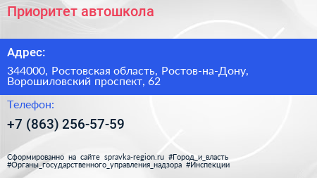 Приоритет, автошкола по адресу 344000, Ростовская область, Ростов-на-Дону, Ворошиловский проспект, 62 в дальнейшем Организация, размещена в следующих категориях: