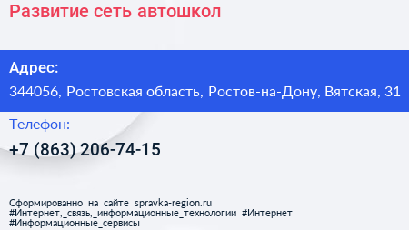 Развитие, сеть автошкол по адресу 344056, Ростовская область, Ростов-на-Дону, Вятская, 31 в дальнейшем Организация, размещена в следующих категориях:
