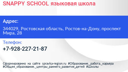 SNAPPY SCHOOL, языковая школа по адресу 344029, Ростовская область, Ростов-на-Дону, проспект Мира, 28 в дальнейшем Организация, размещена в следующих категориях: