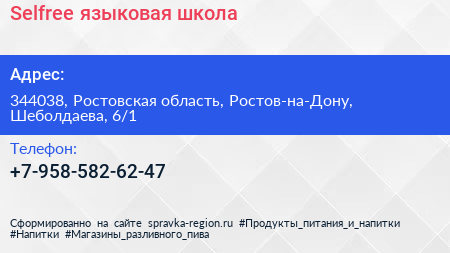 Selfree, языковая школа по адресу 344038, Ростовская область, Ростов-на-Дону, Шеболдаева, 6/1 в дальнейшем Организация, размещена в следующих категориях: