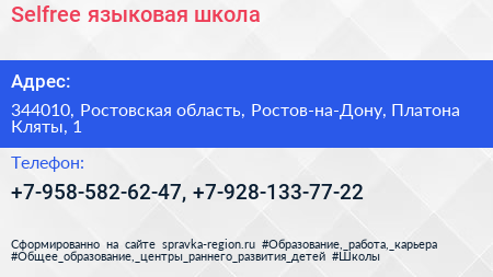 Selfree, языковая школа по адресу 344010, Ростовская область, Ростов-на-Дону, Платона Кляты, 1 в дальнейшем Организация, размещена в следующих категориях: