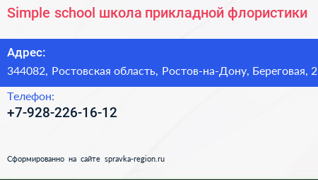 Simple school, школа прикладной флористики по адресу 344082, Ростовская область, Ростов-на-Дону, Береговая, 2 в дальнейшем Организация, размещена в следующих категориях:
