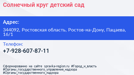 Солнечный круг, детский сад по адресу 344092, Ростовская область, Ростов-на-Дону, Пацаева, 16/1 в дальнейшем Организация, размещена в следующих категориях: