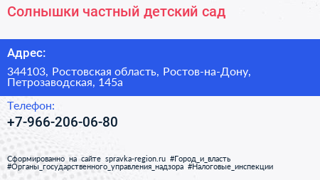 Солнышки, частный детский сад по адресу 344103, Ростовская область, Ростов-на-Дону, Петрозаводская, 145а в дальнейшем Организация, размещена в следующих категориях: