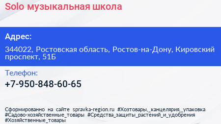Solo, музыкальная школа по адресу 344022, Ростовская область, Ростов-на-Дону, Кировский проспект, 51Б в дальнейшем Организация, размещена в следующих категориях: