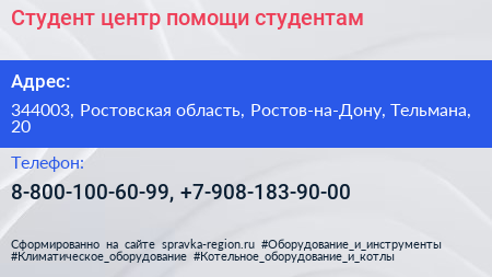 Студент, центр помощи студентам по адресу 344003, Ростовская область, Ростов-на-Дону, Тельмана, 20 в дальнейшем Организация, размещена в следующих категориях: