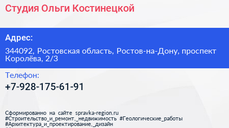 Студия Ольги Костинецкой по адресу 344092, Ростовская область, Ростов-на-Дону, проспект Королёва, 2/3 в дальнейшем Организация, размещена в следующих категориях: