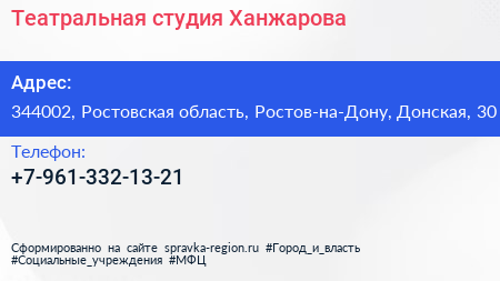 Театральная студия Ханжарова по адресу 344002, Ростовская область, Ростов-на-Дону, Донская, 30 в дальнейшем Организация, размещена в следующих категориях: