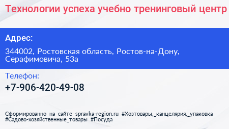Технологии успеха, учебно-тренинговый центр по адресу 344002, Ростовская область, Ростов-на-Дону, Серафимовича, 53а в дальнейшем Организация, размещена в следующих категориях: