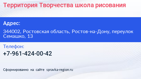 Территория Творчества, школа рисования по адресу 344002, Ростовская область, Ростов-на-Дону, переулок Семашко, 13 в дальнейшем Организация, размещена в следующих категориях:
