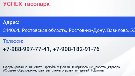 УСПЕХ, тасопарк по адресу 344064, Ростовская область, Ростов-на-Дону, Вавилова, 53 в дальнейшем Организация, размещена в следующих категориях: