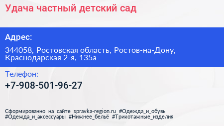Удача, частный детский сад по адресу 344058, Ростовская область, Ростов-на-Дону, Краснодарская 2-я, 135а в дальнейшем Организация, размещена в следующих категориях: