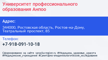 Университет профессионального образования Анпоо по адресу 344000, Ростовская область, Ростов-на-Дону, Театральный проспект, 85 в дальнейшем Организация, размещена в следующих категориях: