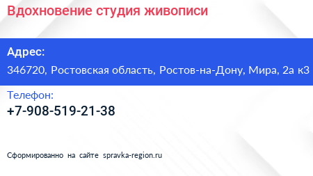 Вдохновение, студия живописи по адресу 346720, Ростовская область, Ростов-на-Дону, Мира, 2а к3 в дальнейшем Организация, размещена в следующих категориях:
