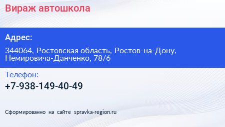 Вираж, автошкола по адресу 344064, Ростовская область, Ростов-на-Дону, Немировича-Данченко, 78/6 в дальнейшем Организация, размещена в следующих категориях: