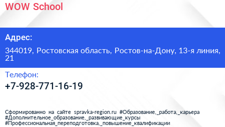 WOW-School по адресу 344019, Ростовская область, Ростов-на-Дону, 13-я линия, 21 в дальнейшем Организация, размещена в следующих категориях: