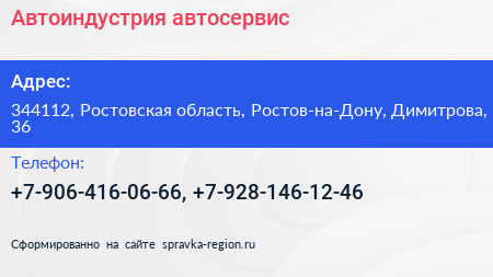 Автоиндустрия, автосервис по адресу 344112, Ростовская область, Ростов-на-Дону, Димитрова, 36 в дальнейшем Организация, размещена в следующих категориях: