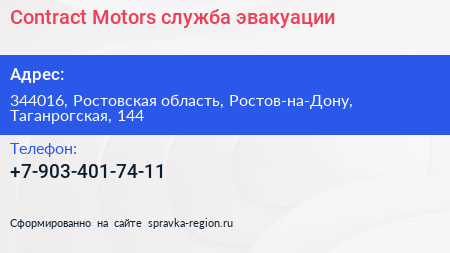 Contract-Motors, служба эвакуации по адресу 344016, Ростовская область, Ростов-на-Дону, Таганрогская, 144 в дальнейшем Организация, размещена в следующих категориях: