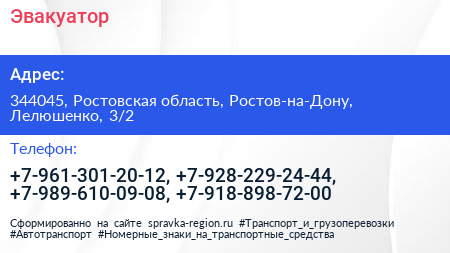 Эвакуатор по адресу 344045, Ростовская область, Ростов-на-Дону, Лелюшенко, 3/2 в дальнейшем Организация, размещена в следующих категориях: