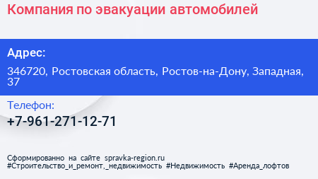 Компания по эвакуации автомобилей по адресу 346720, Ростовская область, Ростов-на-Дону, Западная, 37 в дальнейшем Организация, размещена в следующих категориях: