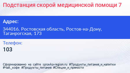 Подстанция скорой медицинской помощи №7 по адресу 344016, Ростовская область, Ростов-на-Дону, Таганрогская, 173 в дальнейшем Организация, размещена в следующих категориях: