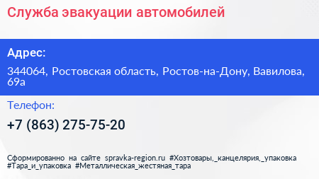 Служба эвакуации автомобилей по адресу 344064, Ростовская область, Ростов-на-Дону, Вавилова, 69а в дальнейшем Организация, размещена в следующих категориях: