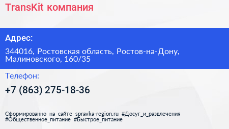 TransKit, компания по адресу 344016, Ростовская область, Ростов-на-Дону, Малиновского, 160/35 в дальнейшем Организация, размещена в следующих категориях: