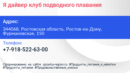Я дайвер, клуб подводного плавания по адресу 344068, Ростовская область, Ростов-на-Дону, Фурмановская, 150 в дальнейшем Организация, размещена в следующих категориях: