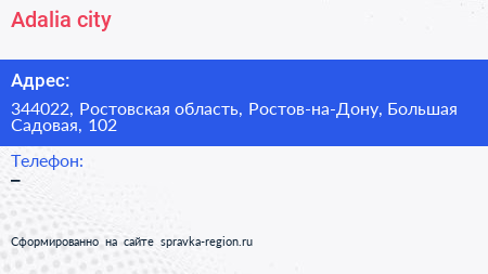 Adalia city по адресу 344022, Ростовская область, Ростов-на-Дону, Большая Садовая, 102 в дальнейшем Организация, размещена в следующих категориях: