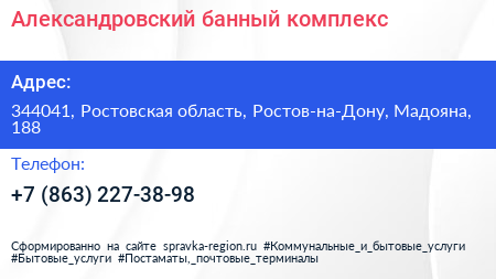 Александровский, банный комплекс по адресу 344041, Ростовская область, Ростов-на-Дону, Мадояна, 188 в дальнейшем Организация, размещена в следующих категориях: