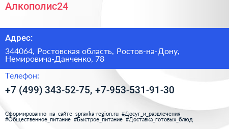 Алкополис24 по адресу 344064, Ростовская область, Ростов-на-Дону, Немировича-Данченко, 78 в дальнейшем Организация, размещена в следующих категориях: