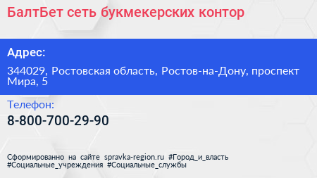 БалтБет, сеть букмекерских контор по адресу 344029, Ростовская область, Ростов-на-Дону, проспект Мира, 5 в дальнейшем Организация, размещена в следующих категориях: