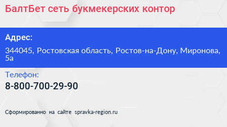 БалтБет, сеть букмекерских контор по адресу 344045, Ростовская область, Ростов-на-Дону, Миронова, 5а в дальнейшем Организация, размещена в следующих категориях: